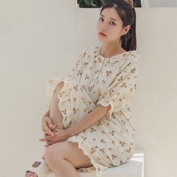 곰인형 반소매 프릴 잠옷 원피스