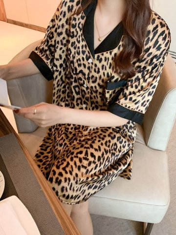 베네샤 부드러운 실크 레오파드 홈웨어 호피 파자마 원피스 잠옷