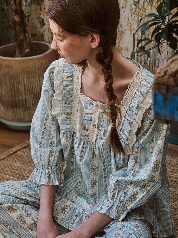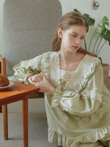 레이스 리본 긴팔 원피스 파자마 홈웨어 잠옷 상하 세트