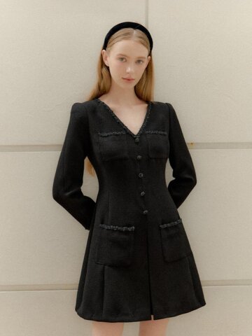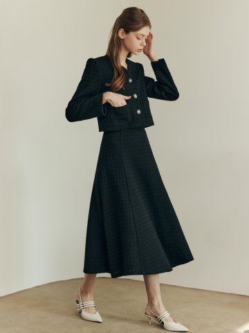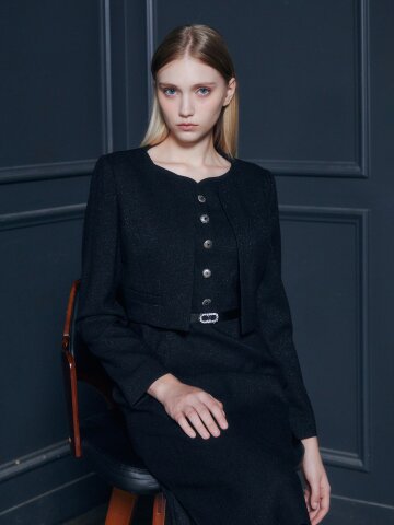 [세트] 브이넥 트위드 자켓 & 스커트 / 솔리드 블랙