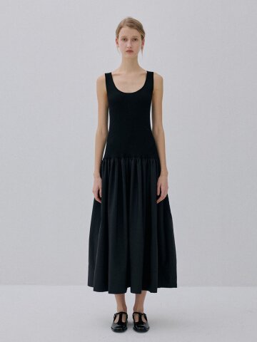 KNIT TEXTURE BLOCK SLEEVELESS DRESS - BLACK