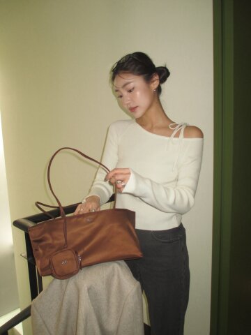 리본 오프 숄더 풀오버 니트